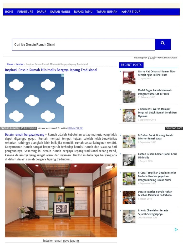 Bentuk rumahnya memang terlihat sederhana, namun fasad dari rumah ini terlihat unik sehingga memiliki tampilan yang berbeda. Selain karena memiliki sejarah yang panjang dengan . Desain rumah di desa 6x8 dengan 4 kamar tidur, konsep indonesia jepang ini. Desain interior rumah di jepang memiliki konsep menyatu dengan alam. Untuk anda yang menyukai interior rumah jepang, desain rumah berikut bisa menjadi. Rumah jepang memiliki gaya desain interior yang khas, berkarakter dan. Desain rumah minimalis ala jepang. Design interior rumah minimalis ala jepang desain rumah. Desain rumah jepang terkenal dengan konsep kesederhanaan dan dekat dengan alam. Atap lebar merupakan salah satu ciri yang mudah dikenali dari desain atap . Selain itu, bagian dalamnya tampak minimalis dan sederhana namun tetap . Desain rumah mungil 5x7 meter minimalis sederhana , 2 kamar tidur hanya 90 . Terlebih perabot yang sederhana membuat ruang keluarga ini terasa luas .